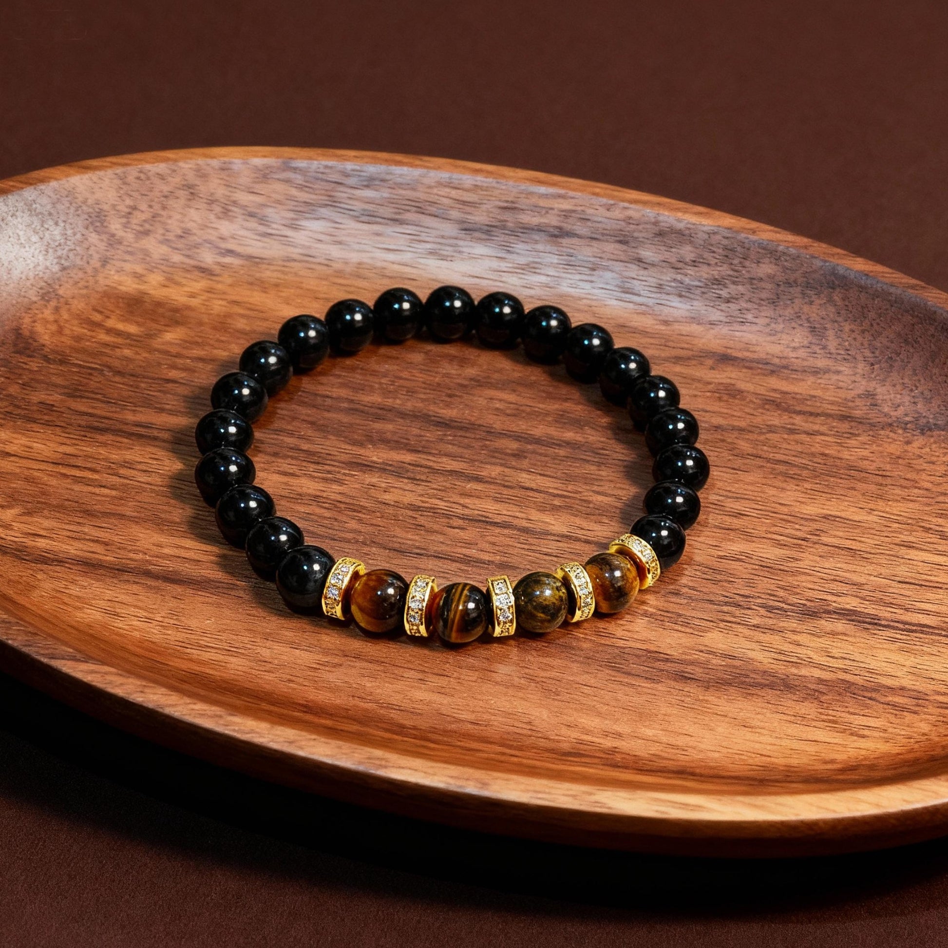This bracelet is a powerful talisman for modern life. The 11 Obsidian beads form a protective shield around your aura, deflecting negativity and stress. The 4 Tiger's Eye stones, strategically set apart by metallic spacers, are your beacons of courage and focus, helping you to face challenges with confidence and clarity.